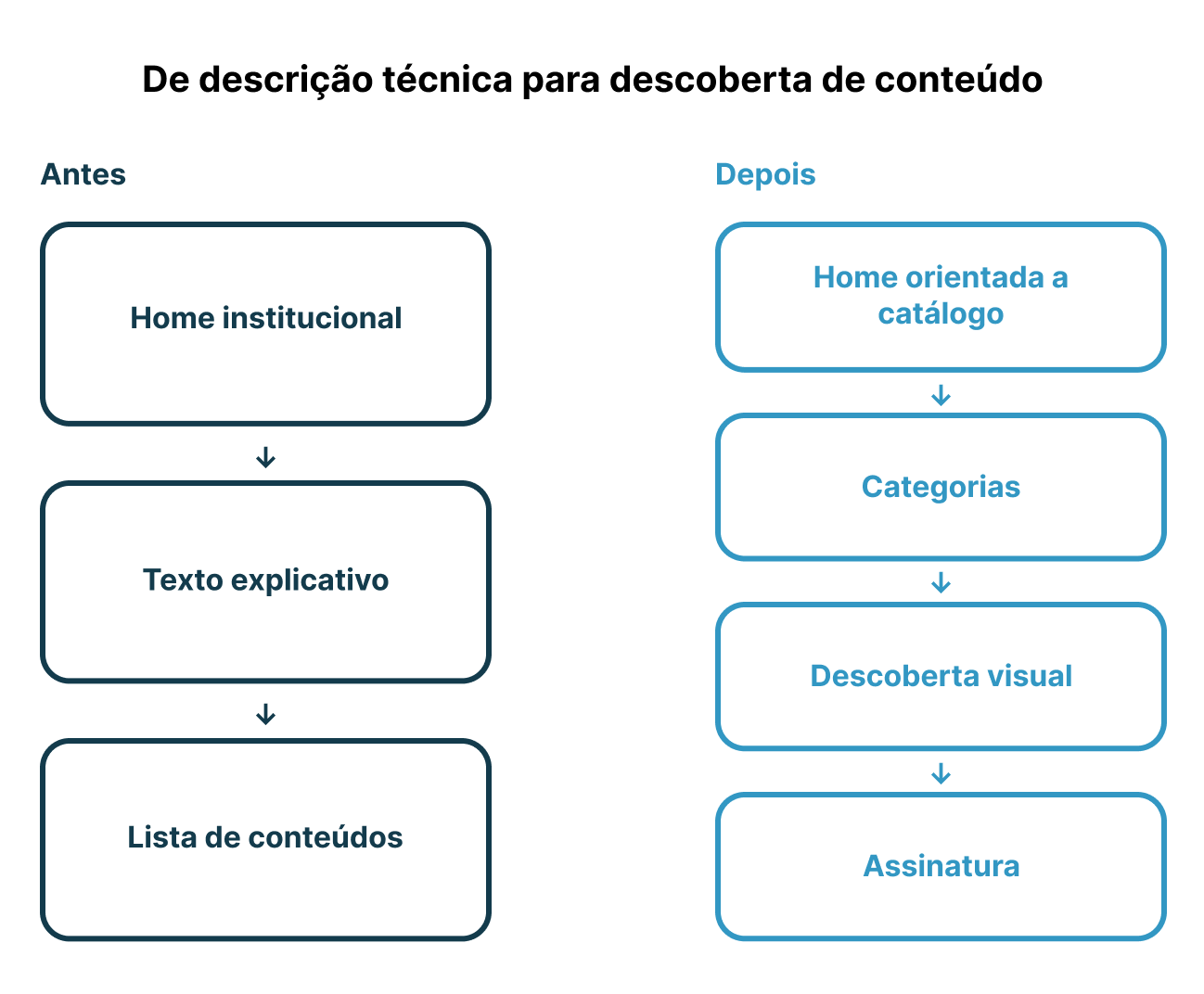 Ao simplificar a narrativa e estruturar a experiência como descoberta de catálogo, a percepção de complexidade caiu de forma consistente, sem alterar o produto.